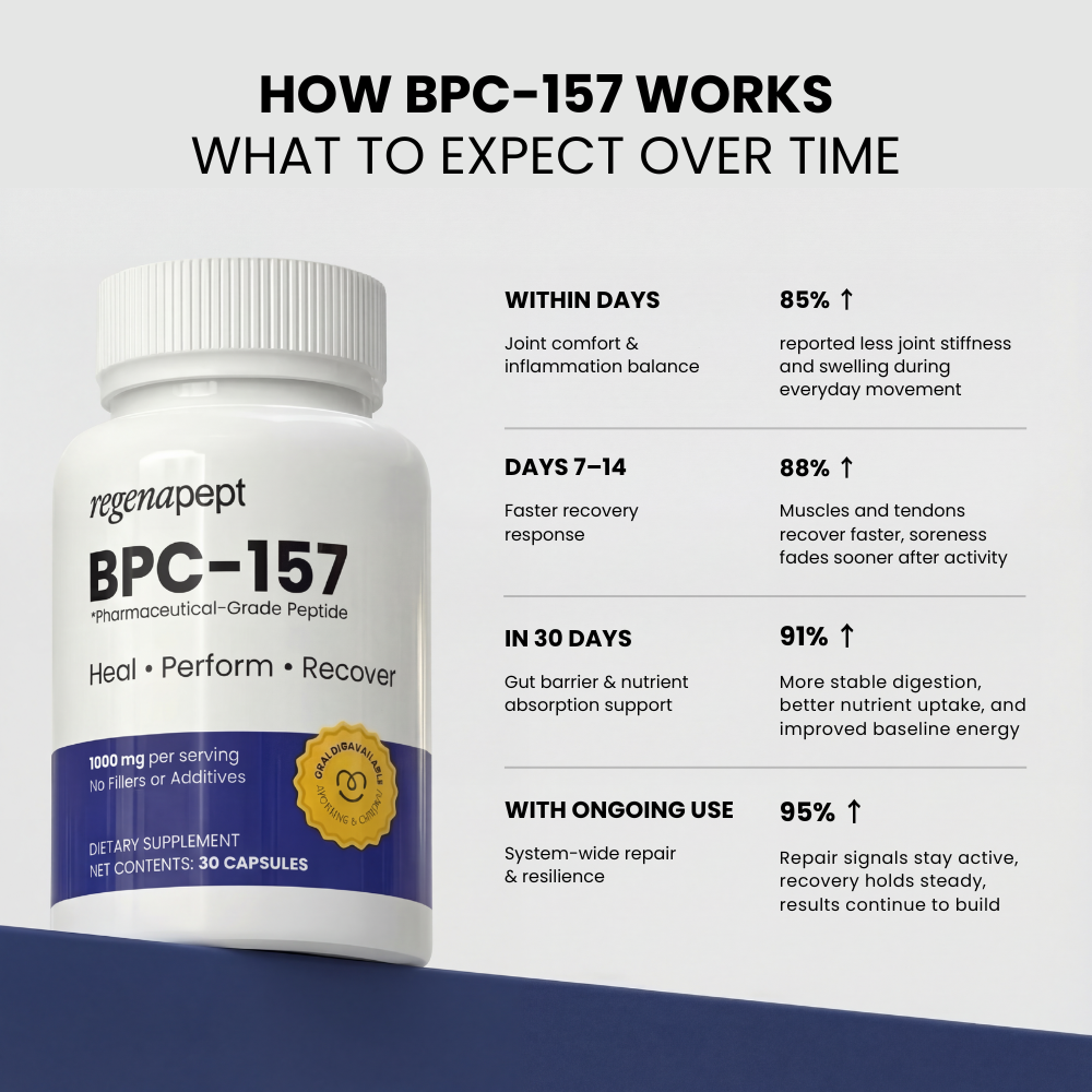 Whether you're dealing with sore joints, slow recovery, or persistent gut issues — BPC-157 helps your body heal from within. It’s designed to support recovery, reduce inflammation, and repair tissue at the root level, no injections, no medications.
