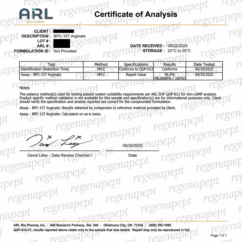 The Arginine Salt form improves stability and absorption, allowing more of the peptide to remain intact through digestion. This supports consistent interaction with gut tissue and systemic repair signaling over time.